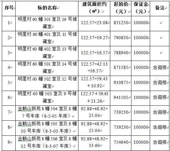 一、拍卖标的:位于德清县乾元镇九曲龙庭明星村新苑、金鹅山新苑的9套住房及明星村新苑的一批车库、储藏室,详见下表: